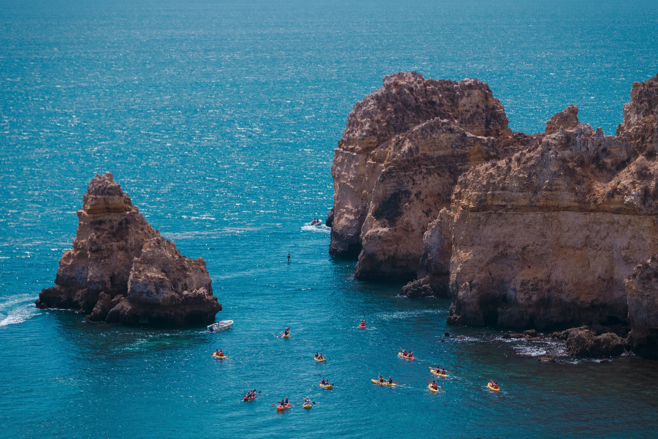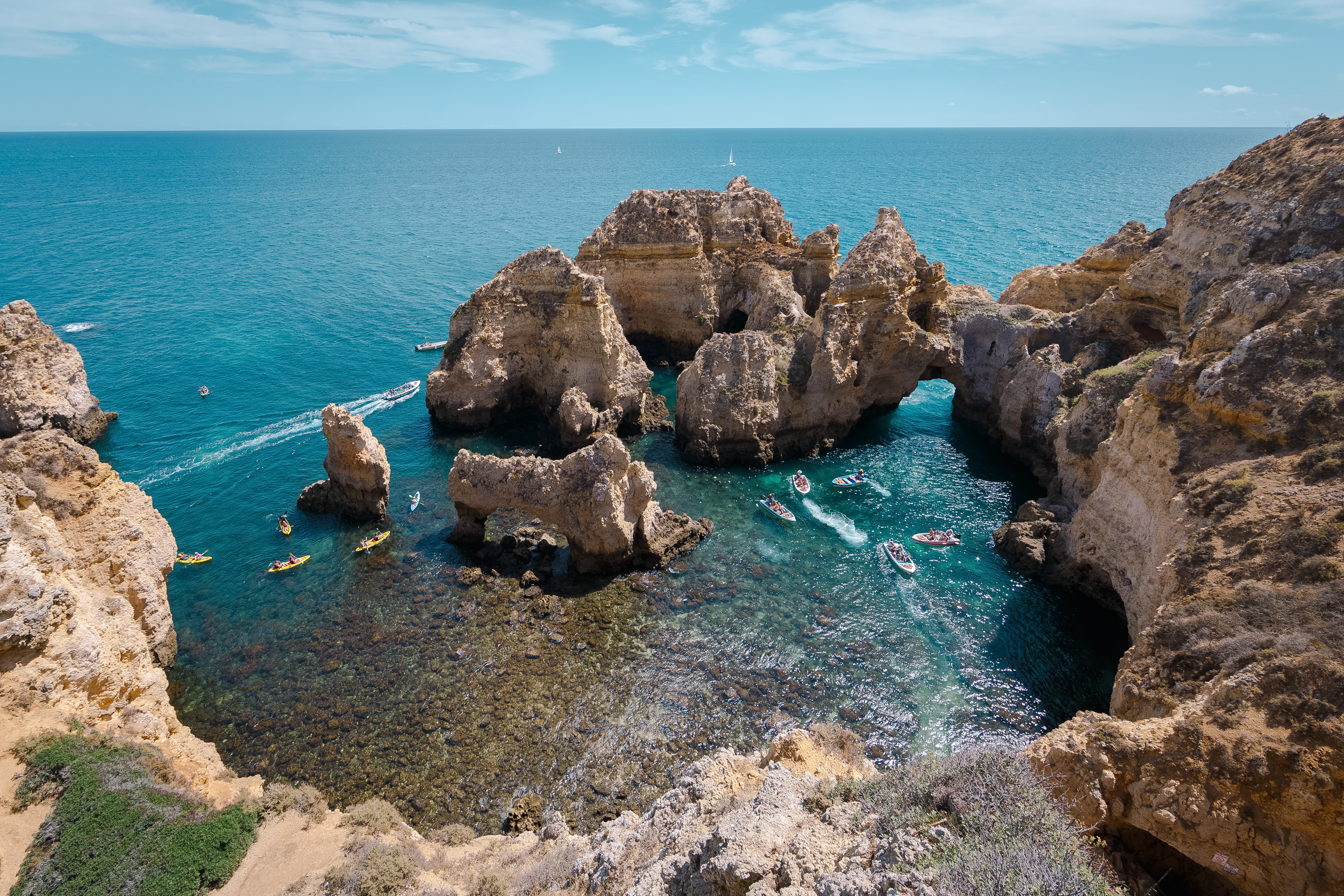 Down on the southern coast of Portugal lies an area called the Algarve, lined with massive sandstone cliffs carved out by the sea. Popular for surfing, swimming, fishing, and tourism alike, this area will have you enamored with the colorful scenes and secret beach grottos lining the coast. These shots are from the area around Lagos, the main tourist hub in the region, with arguably some of the most accessible coastline. You can spend days hiking on top of the red cliffs and climb or dive down into the turquoise waters that lie below.