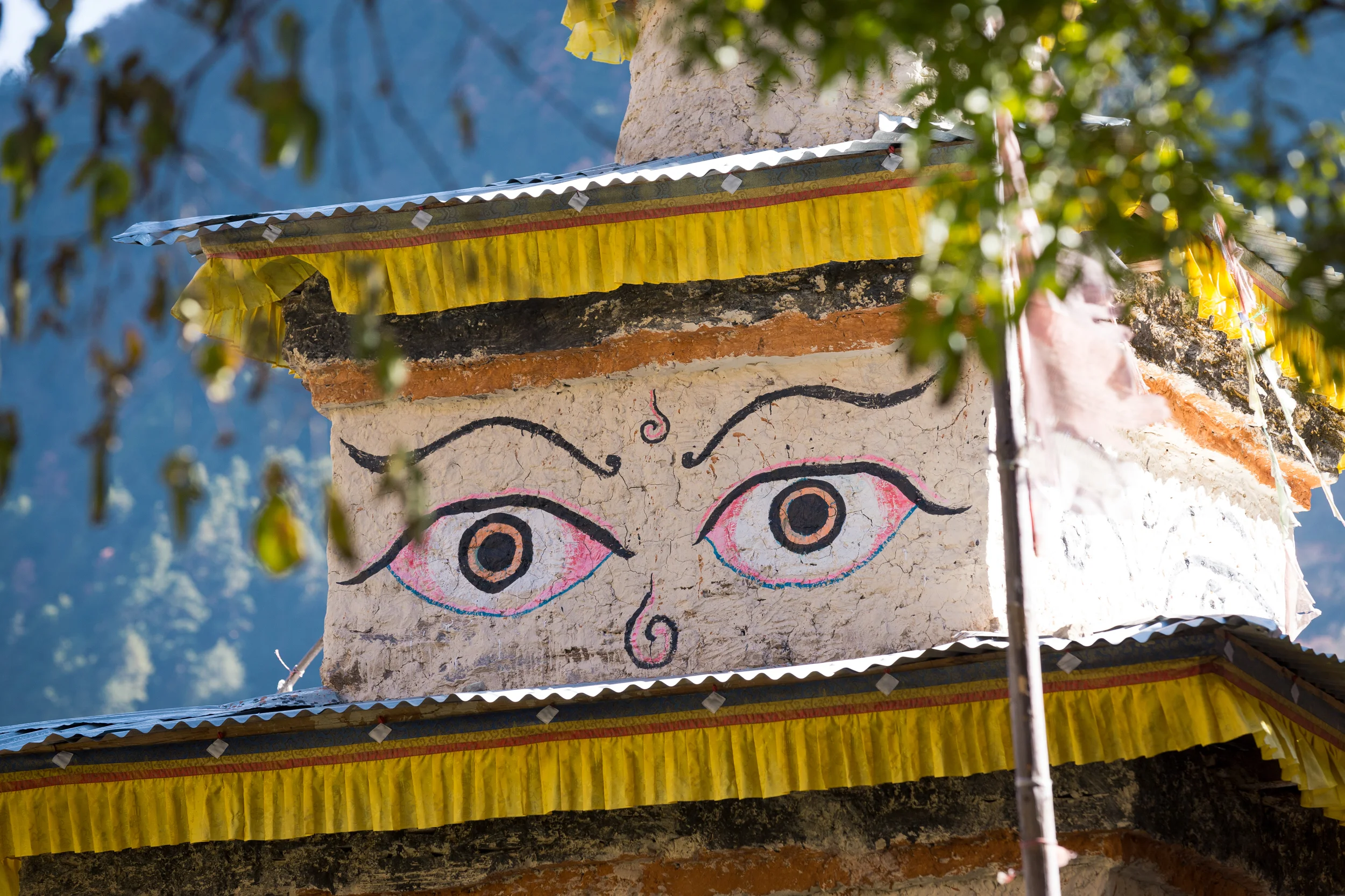 We climbed down from Prok for three hours to the riverside village of Namrung, where we ran into the first source of Wi-Fi in the two weeks we had been trekking. To be quite honest, it was great to be able to check in with loved ones, but it didn't feel natural to be able to contact the outside world on an adventure such as this. After this distracted lunch hour, we continued again along the Buddhi Gandaki River through lush foliage and massive Indiana Jones-esque boulders and again climbed upwards. The ensuing five hours took us up through mountain villages with stupas painted with the eyes of Buddha that followed us as we trekked on through.