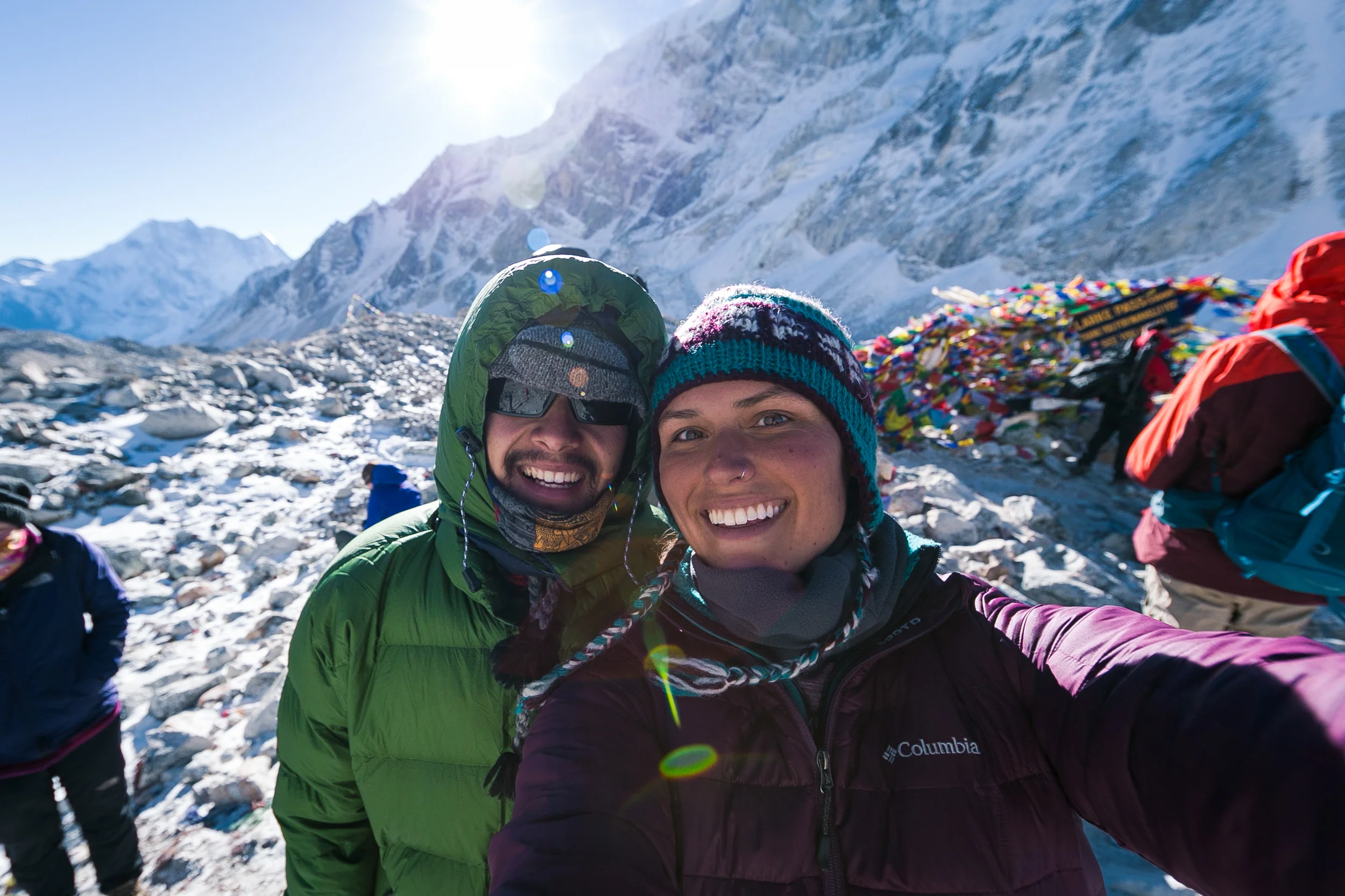 The glaciers flanking our left side cracked with massive avalanches falling from height. The rocky pathway and frozen lakes on our right were difficult to traverse and slippery under our feet. Around 8:00AM, we ascended a rocky hill that was illuminated with mazes of colorful prayer flags and I screamed aloud in excitement that we had finally made it! 5,106 meters tall into the sky; around 17,000 feet! I couldn't believe that 18 days after our journey had begun, we had finally made it. We stopped to take photos and lay a few more flags amongst the rest. The feeling of gratitude and sheer joy filled the joy as more trekkers ascended to join us.