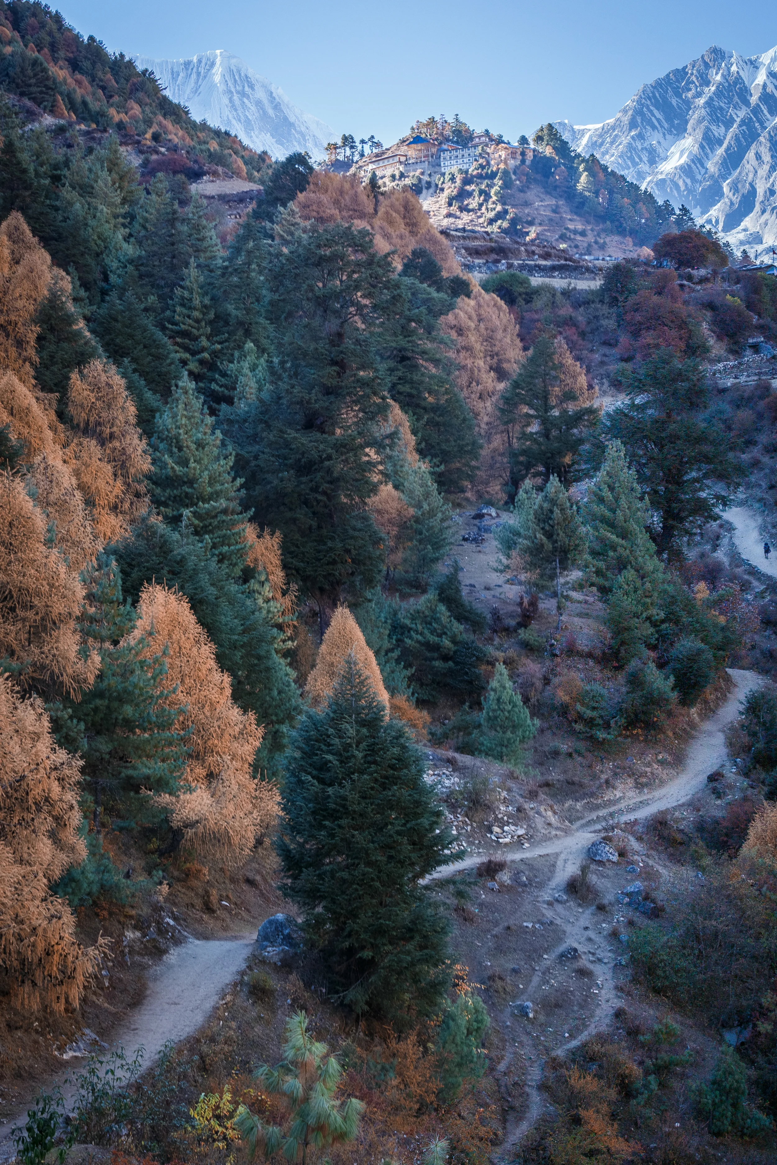 As the daylight began to recede, I crossed through a forest of orange and green pines and Mt. Manaslu came into view right in front of our eyes. The village of Lho appeared like a fairy tale with the massive mountain smoking in the background. Clouds whipped around the peak and turned shades of pink and purple as the sun set and again I was humbled that such beauty can exist in this world. One of the most incredible sights I've ever seen in my life. We even had perfect clarity that evening, so Jimee, Shalom, and I watched the Milky Way fly around the sky around Manaslu.